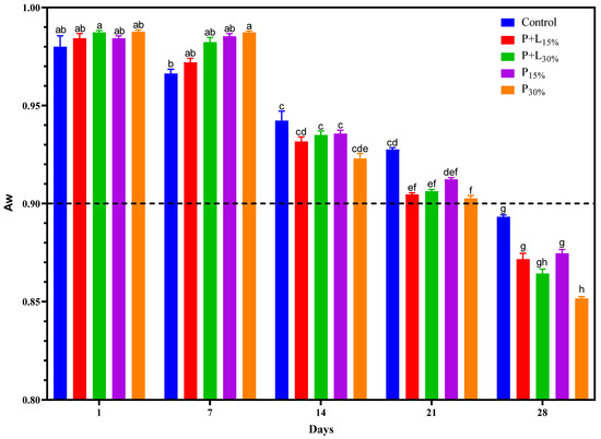Aw values during the processing of salamis that had undergone animal fat replacement with gels of psyllium fiber and combined linseed oil–psyllium fiber. Distinct letters demonstrate significant variations in Tukey’s analysis (p < 0.05). Error bars represent the standard error of the mean. Batches: Control: 20% pork back fat; P+L15% and P+L30%: 15% and 30% substitution of pork back fat with combined linseed oil–psyllium fiber gel, respectively; P15% and P30%: 15% and 30% substitution of pork back fat with gel of psyllium fiber, respectively.