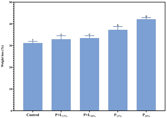 Weight loss of salamis that had undergone animal fat replacement with gels of psyllium fiber and combined linseed oil–psyllium fiber. Distinct letters demonstrate significant variations in Tukey’s analysis (p < 0.05). Error bars represent the standard error of the mean. Batches: Control: 20% pork back fat; P+L15% and P+L30%: 15% and 30% substitution of pork back fat with combined linseed oil–psyllium fiber gel, respectively; P15% and P30%: 15% and 30% substitution of pork back fat with gel of psyllium fiber, respectively.