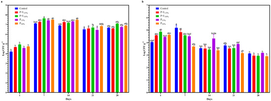 Lactic acid bacteria (a) and micrococci (b) counts of salamis that had undergone animal fat replacement with gels of psyllium fiber and combined linseed oil–psyllium fiber. Distinct letters demonstrate significant variations in Tukey’s analysis (p < 0.05). Error bars represent the standard error of the mean. Batches: Control: 20% pork back fat; P+L15% and P+L30%: 15% and 30% substitution of pork back fat with combined linseed oil–psyllium fiber gel, respectively; P15% and P30%: 15% and 30% substitution of pork back fat with gel of psyllium fiber, respectively.