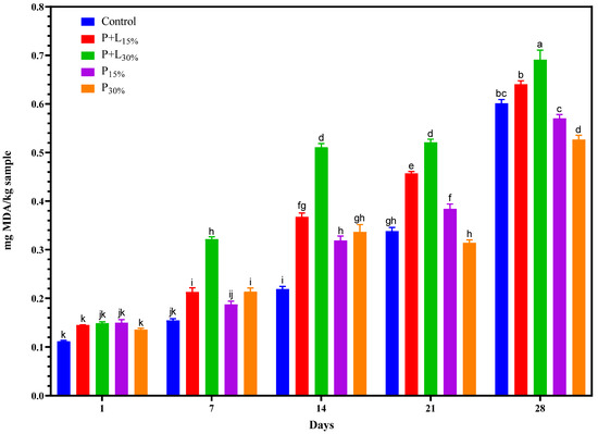 TBARS values during the processing of salamis that had undergone animal fat replacement with gels of psyllium fiber and combined linseed oil–psyllium fiber. Distinct letters demonstrate significant variations in Tukey’s analysis (p < 0.05). Error bars represent the standard error of the mean. Batches: Control: 20% pork back fat; P+L15% and P+L30%: 15% and 30% substitution of pork back fat with combined linseed oil–psyllium fiber gel, respectively; P15% and P30%: 15% and 30% substitution of pork back fat with gel of psyllium fiber, respectively.