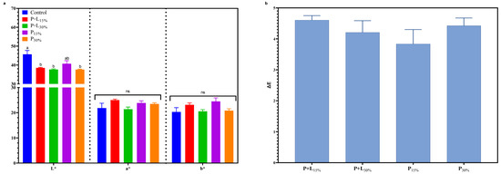 Instrumental color (L*, a*, and b*) (a) and ΔE values (b) of salamis that had undergone animal fat replacement with gels of psyllium fiber and combined linseed oil–psyllium fiber. Distinct letters demonstrate significant variations in Tukey’s analysis (p < 0.05). Error bars represent the standard error of the mean. Batches: Control: 20% pork back fat; P+L15% and P+L30%: 15% and 30% substitution of pork back fat with combined linseed oil–psyllium fiber gel, respectively; P15% and P30%: 15% and 30% substitution of pork back fat with gel of psyllium fiber, respectively. n.s.: not significant.
