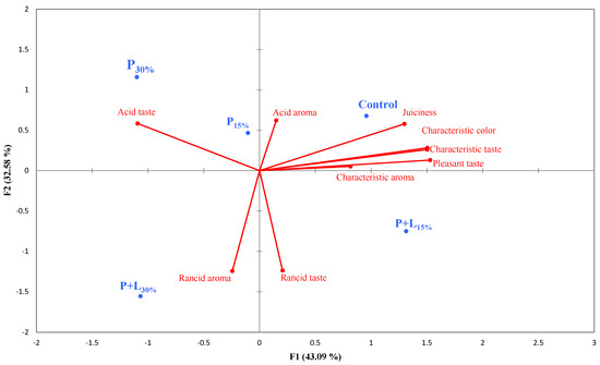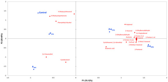 Principal component analysis (PCA) of the volatile compounds of salamis that had undergone animal fat replacement with gels of psyllium fiber and combined linseed oil–psyllium fiber. Batches: Control: 20% pork back fat; P+L15% and P+L30%: 15% and 30% substitution of pork back fat with combined linseed oil–psyllium fiber gel, respectively; P15% and P30%: 15% and 30% substitution of pork back fat with gel of psyllium fiber, respectively.