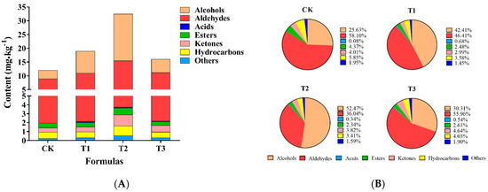 (A) Overall flavor compounds concentration (mg/kg button mushrooms relative to internal standard) of Agaricus bisporus cultivated in different compost. (B) Changes in the proportion of volatile compounds in each category under four treatments. CK, control group; T1, T2, and T3 indicate treatment groups with tea residue contents of 10%, 20%, and 37.5%, respectively.