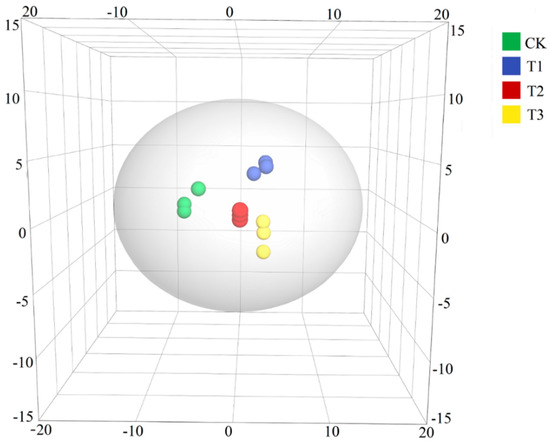 Principal component analysis (PCA) of differential volatile compounds in button mushroom samples. PC1 = 57.6%, PC2 = 22.6%, PC3 = 9.14%. CK, control group; T1, T2, and T3 indicate treatment groups with tea residue contents of 10%, 20%, and 37.5%, respectively.