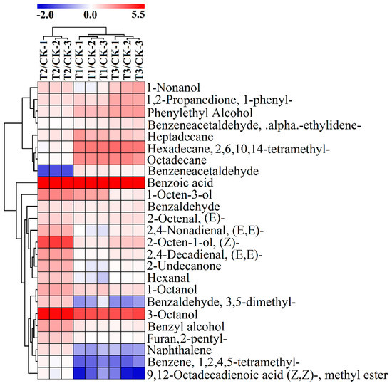 Hierarchical Clustering Analysis (HCA) of differential volatile metabolites. CK, control group; T1, T2, and T3 indicate treatment groups with tea residue contents of 10%, 20%, and 37.5%, respectively.