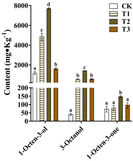 A variety of volatile compounds have been reported as the major aroma compounds of mushrooms, among which C8 compounds are the main source of the characteristic flavor of many mushrooms. Tagkouli (2021) [42] detected the volatiles of Pleurotus eryngii and Pleurotus ostreatus in the study, and the results showed that the volatiles were mainly C8 compounds, accounting for 78~83% and 84~91% of the total volatiles respectively, especially 1-octen-3-ol, 3-octanol, and 1-octen-3-one, which were described as distinctive “mushroom-like flavor” and considered as the main active aroma compounds, and 1-octen-3-ol was also known as “mushroom alcohol” [43,44]. As depicted in Figure 4, compared with the control group, the addition of TER into culture medium was found effective in terms of improving the amount of the three typical mushroom flavor compounds, especially in the 20% TER treatment group. These three compounds were identified as enzymic breakdown products of linoleic acids [45]. Lipoxygenase was assumed as a key enzyme for biosynthesis of the flavor compounds by forming of hydroperoxides of unsaturated fatty acids (mainly linoleic and linolenic acids), which further cleaved into volatile aldehydes and alcohols. Exogenous addition of linoleic acids to homogenate of mushroom mycelium could significantly increase the content of 1-octen-3-ol [46]. Fatty acids were reported as key precursors for aroma formation of tea, and unsaturated fatty acids were precursors of C6–C10 aroma compounds in tea [47]. Using green tea and instant green tea as the samples, the fatty acid methyl esters were prepared by the sulfuric acid-methanol method and analyzed by GC-MS, and the results showed that there were slightly free fatty acids in instant green tea [48]. Therefore, the large amount of fatty acids remaining in the TER could be beneficial to provide more flavor precursor molecules for the growth of button mushroom. This might be related to the addition of 10~20% TER to the cultured substrate, which could be advantageous to stimulate the metabolism of unsaturated fatty acids in button mushroom, thereby changing the composition and ratio of aroma compounds. Shashirekha et al. (2005) [29] demonstrated that small degrees of cotton seed powder supplementation in rice straw substrate could increase in the content of unsaturated fatty acid in Pleurotusostreatus, especially linolenic acids, which provided precursor molecules for the production and transformation of mushroom flavor substances. In addition, compared with the CK group, the content of benzaldehyde in the T1, T2 and T3 treatment groups all increased. This volatile compound was related to the catabolism or oxidative degradation of phenylalanine [42,49]. In the present experiment, it was observed that the content of phenylalanine in the fruite bodies produced by all tea residue treatment groups was increased, which may be the main reason for the increase of benzaldehyde content.