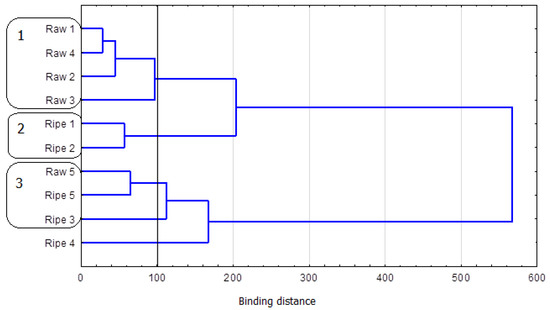 Other assays we performed do not imply any other relationship which could be used for confirming that Pu-erh teas are genuine. In the Raw Pu-erh group, younger teas contained more theobromine than their older equivalents. Thus, it is possible that when the tea-ripening time is longer, the content of theophylline will decrease, and, in turn, the level of caffeine will increase (the relationship between the content of theophylline and caffeine is determined by the above-described conversions). However, the existence of such a relationship needs to be corroborated by further studies. The results for the total content of theobromine, theophylline, and caffeine also do not reveal the existence of a relationship that could be used as a tool for the identification of Pu-erh tea types. Thus, we decided to verify whether grouping based on three parameters in the multivariate cluster analysis would show other relationships between the evaluated samples. Figure 2 presents three clusters according to the binding distance for respective stages at an agglomeration distance of 100.