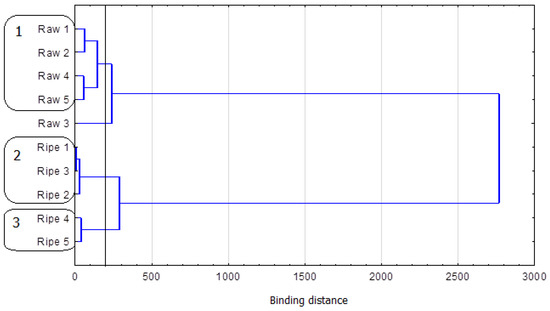 The presented grouping for the selected agglomeration distance includes more than two groups of teas. In addition, one of the analyzed samples was not included in any cluster. This could suggest that the analysis of the content of theogallin and gallic acid may not be an efficient tool for the identification of Raw and Ripe Pu-erh tea. Nevertheless, the presented method is 100% efficient for larger agglomeration distances (>300).