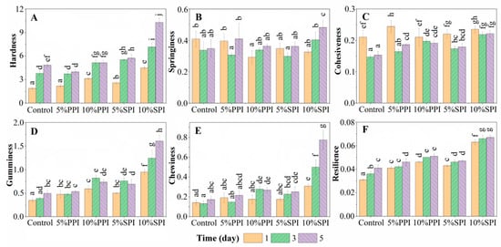 | Hardness | Springiness | Cohesiveness | Gumminess | Chewiness | Resilience | G′ | G″ | G* | tan δ | η* | ή | |