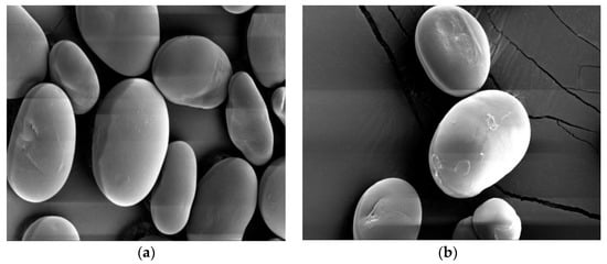 - Tappiban, P.; Zhao, J.; Zhang, Y.; Gao, Y.; Zhang, L.; Bao, J. Effects of single and dual modifications through electron beam irradiation and hydroxypropylation on physicochemical properties of potato and corn starches. Int. J. Biol. Macromol. 2022, 220, 1579–1588. [Google Scholar] [CrossRef] [PubMed]