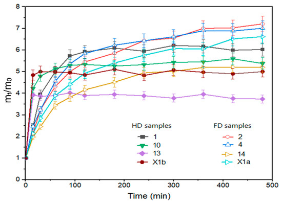Rehydration ratio of pepper samples, freeze-dried: 1, 10, 13 and hot air-dried: 2, 4, 14 from FFD (Table S1); X1a—hot air-dried control without pretreatment; X1b—freeze-dried control without pretreatment.