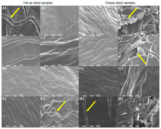 SEM micrographs of the dried sweet pepper: (A1)—outer and (A2)—the inner surface of HD sample without pretreatment; (B1)—outer and (B2)—the inner surface of FD sample without pretreatment; (C1)—outer and (C2)—the inner surface of sample 2 from FFD; (D1)—outer and (D2)—the inner surface of sample 4 from FFD; (E1)—outer and (E2)—the inner surface of sample 14 from FFD; (F1)—outer and (F2)—the inner surface of sample 6 from FFD; (G1)—outer and (G2)—the inner surface of sample 11 from FFD; (H1)—outer and (H2)—the inner surface of sample 16 from FFD. Arrows indicate cracks formed during drying.