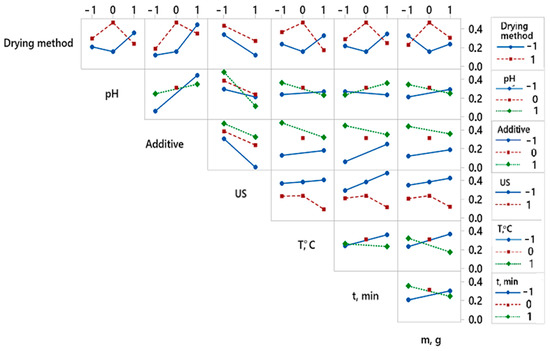 By analyzing the experimental results with overall desirability function, it was found that the best quality of dried red pepper is significantly influenced by two pretreatment parameters, i.e., ultrasonic pretreatment and type of applied additive (Figure 3). The analysis of variance for the desirability function is presented in Table 2. The better overall quality of dried pepper, when considering 12 responses, is achieved with the following pretreatment: pH value 6.5, KMS pretreatment without applied ultrasound during 3 min at 50 °C, mass to volume ratio 100:1 (g:L), and final freeze-drying (Figure 4). For the overall quality of dried red pepper, ultrasonic pretreatment had a negative effect, probably due to cell wall raptures and the leaching of different bioactive compounds. Applying ultrasound waves in a liquid medium produces cavitations that cause sudden and localized changes in temperature and pressure [57,58]. As a result, bubbles form, rapidly grow, and collapse. When a solid is present in the liquid medium, the acoustic wave can form a microjet in the bubble. This microjet moves through the bubble, leaves it, and passes into the solid, changing the solid structure [1,57,58]. This further leads to the liquid extraction from the solid and the fluid penetration from the outside. The formation of microscopic channels may also occur and facilitate mass transport [1,58]. An interaction plot for 7 observed variables and 12 responses is given in Figure 4.