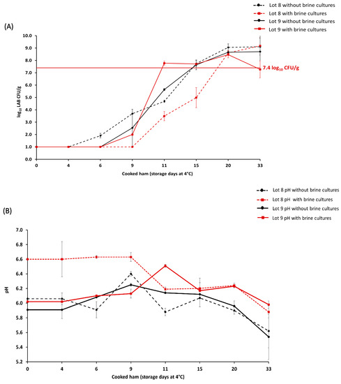 Average lactic acid bacteria (LAB) count (log10 CFU/g) in cooked ham lots 8 and 9 with (n = 32) and without (n = 32) brine cultures until day 33 of storage (A). The maximum acceptable microbial limit of ≥7.4 LAB log10 CFU/g during the cooked ham storage is marked with a horizontal, full red line. pH in cooked ham lots 8 and 9 measured until the day 33 of storage (B). The representation of cooked ham without brine cultures (●) is denoted in black, while samples with brine cultures (■) are shown in red.