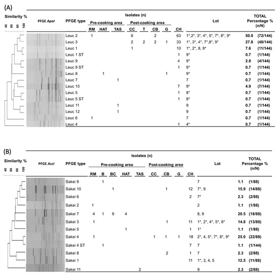 Unweighted pair group method with arithmetic mean (UPGMA) dendrogram with dice coefficient and 1.5% position tolerance among XbaI and AscI pulsed-field gel electrophoresis (PFGE) patterns of Leuconostoc (Leuc.) carnosum (A) and Latilactobacillus (Lb.) sakei (B) isolates from raw meat, food processing environments, and cooked ham. Abbreviations: B: brine; BC: brine cultures; CB: cutting board; CH: cooked ham G: gloves during packaging of the end product; HAT: ham after tumbling; CC: cellulose casing; RM: raw meat; RMDB: raw meat delivery box; T: trolley; TAS: tumbler after sanitation; *: represents the isolation of the PFGE type from cooked ham.