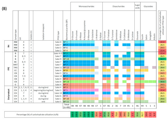 Biochemical profiles were generated based on the 49-carbohydrate utilization ability of Leuconostoc (Leuc.) carnosum (n = 51) (A) and Latilactobacillus (Lb.) sakei (n = 48) (B) isolates. All carbohydrate substrates (API 50 CHL) were categorized into monosaccharides, disaccharides, trisaccharides, sugar acids, sugar alcohols, and glycosides. The isolate’s ability to utilize a carbohydrate is represented as a positive (coloration) or negative (white color) reaction. The carbohydrates that were not utilized by a single isolate are not represented in the figure. The isolates were categorized according to sample type into raw meat (RM), food processing environment (FPE), and end product. The Leuc. carnosum and Lb. sakei PFGE types were color-coded representing different biochemical fermentation profiles and carbohydrate utilization patterns. The numbers on the right represent the percentage of carbohydrates utilized per isolate, while the numbers on the bottom represent the percentage of a single carbohydrate per studied group of isolates. Gradient scale: 0% (red)—100% (green). Abbreviations: B: brine; BC: brine cultures; CB: cutting board; CH: cooked ham G: gloves during packaging of the end product; HAT: ham after tumbling; CC: cellulose casing; RM: raw meat; RMDB: raw meat delivery box; T: trolley; TAS: tumbler after sanitation.