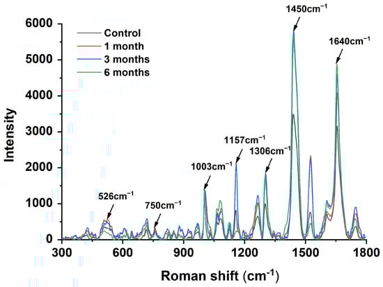 In recent years, Raman spectroscopy has been increasingly used to determine chemical structures [26]. The Raman spectra shown in Figure 1 were obtained after the accelerated storage of egg yolk powder at different times. In the protein Raman spectra, the spectral peak at 1640 cm−1 represents the stretching vibration of C=O, reflecting the carbonyl content. As shown in Figure 1, the spectral peak intensity gradually increased with the storage time, representing an increase in protein carbonyl content. The 500–530 cm−1 peak is usually associated with the S-S stretching vibration mode of the disulfide bond C-C-S-S-C-C structure [27]. It was found that the spectral peak intensity in this region decreased gradually with the extension of storage time, and the peak intensity of the egg yolk powder stored for 6 months was the lowest, indicating a reduction in disulfide bond content. The 750 cm−1 region represents the C-S vibration peak of cysteine residues, and it was found that the intensity of the spectral peak decreased gradually with the extension of storage time, which indicates that the content of cysteine (free sulfhydryl group) decreased gradually [28]. The above results are consistent with the results of the contents of each substance determined in Table 1. The peak intensity of 1157 cm−1 represents the tyrosine content, consistent with a mechanism by which lipid free radicals cause protein damage [29]. Hydrophobic interactions involve hydrophobic groups such as aliphatic amino acids. Compared with the control group, the peak strength of the egg yolk powder samples stored for 1–6 months was significantly increased near 1306 cm−1 and 1450 cm −1, and the peak strength of the egg yolk powder samples stored for 6 months was more obvious. Among them, the peak near 1306 cm−1 represents the bending vibration of C-H, while the peak intensity of 1450 cm−1 is related to the bending vibration of CH2 and CH3 [30]. These indicate that prolonged storage promotes the interaction between aromatic and aliphatic amino acid residues in egg yolk powder and facilitates protein aggregation through hydrophobic interactions.