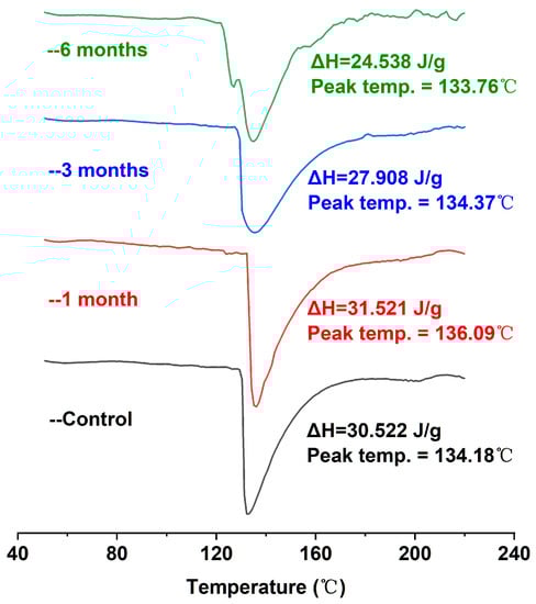 DSC can provide the temperature and enthalpic changes in the process of protein denaturation, which can effectively reflect the conformational changes and thermal stability of proteins. Proteins initially in the folded (native) conformation have higher enthalpic values; the protein undergoes conformational transformation (unfolding), and the ΔH value will gradually decrease [31]. As shown in Figure 2, the DSC scanning analysis of egg yolk powder samples under different storage periods showed a major endothermic peak of around 134 °C in the map. Because there were a large number of lipoproteins in the egg yolk powder samples, including low-density lipoprotein and high-density lipoprotein, they could not be distinguished well with calorimetry, so there was only a major endothermic peak on the image [32]. In addition, it was obvious that with the extension of storage time, the corresponding enthalpy (ΔH) of egg yolk powder gradually decreased. Combined with the results shown in Table 1, the increase in storage time led to the oxidation of proteins in egg yolk powder, indicating that conformational changes occurred in the egg yolk protein during storage, which also indicated that storage led to the oxidation and aggregation of most proteins in the egg yolk powder. As a result, the existing natural protein content was reduced, and the thermal stability was reduced.