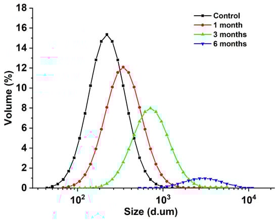 The particle size of the egg yolk liquid sample is a micron, and the particle size change of the egg yolk sample particle aggregate can be measured using a ultrasonic particle size meter, reflecting the effect of storage time on the degree of lipoprotein aggregation in egg yolk [33]. As shown in Figure 3, with the extension of storage time, the particle size of egg yolk liquid gradually increased from 116.27 μm to 3562.62 μm. Combined with the changes in carbonyl and sulfhydryl content, it was found that oxidation aggregation occurred in the egg yolk protein during storage, and with the extension of storage time, the degree of protein oxidation also increased. Covalent crosslinking occurs between protein molecules or subunits [34], and during storage, proteins fold and assemble under van der Waals forces, hydrogen bonds, hydrophobicity, and electrostatic forces, followed by the formation of a larger protein group, increasing in average particle size [35].