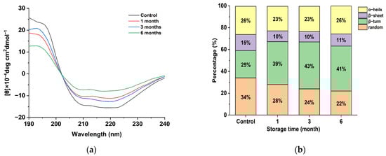 In order to investigate the effect of the spatial conformation change in the egg yolk powder on oil precipitation during storage, the secondary structure changes in the egg yolk powder in different storage periods were analyzed. As can be seen in Figure 4a, the yolk powder had negative peaks at 210 and 225 nm, which is consistent with the two negative characteristic shoulder peaks corresponding to the α-helical structure in this region due to the π-π and n-π transitions of the peptide bond [36]. A positive peak at 195 nm indicates that the yolk powder contains a β-folded structure. The intensity of the positive peak at 195 nm and the negative peak at 210 and 225 nm decreased with the storage time.