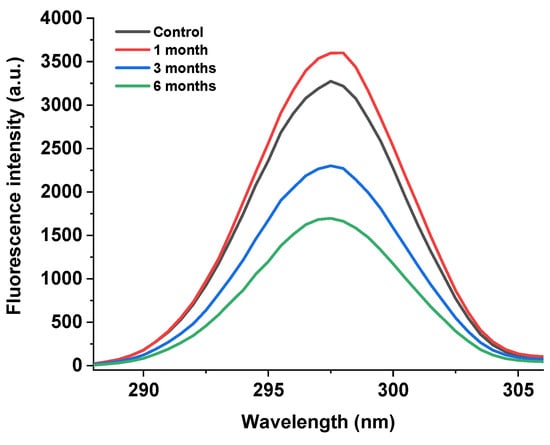 The fluorescence spectrum of the protein is mainly associated with tryptophan [39]. Tryptophan, a common amino acid in food proteins, is sensitive to its environment and ideal for molecular studies to determine structure and protein-folding dynamics and protein–protein interactions [40]. Changes in protein fluorescence intensity reflect the degree of oxidation of tryptophan residues and changes in their microenvironment [41]. However, in egg yolk powder, protein oxidation and lipid oxidation will occur during storage, so the analysis of the results in Figure 5 shows that the decrease in peak intensity may be due to the gradual oxidation of tryptophan by the environment with the increase in storage time, which promotes protein–protein or protein–other compound interactions. Thus, tryptophan is buried in the inner core of the newly formed protein aggregates, a conclusion consistent with the results of Guo et al. [42].