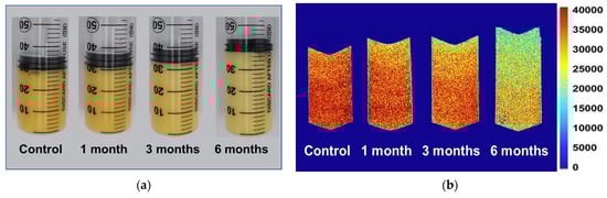 In order to better characterize the distribution and migration of hydrogen protons in different phases in the food system, the egg yolk powder was gelated at different storage periods, and its magnetic resonance imaging (MRI) was measured. In this sample, a 50 mL syringe was used to prepare the gel, so the longitudinal section of the gel was selected in the MRI detection (Figure 6a), and the pseudocolor image was obtained through later software processing. It can be intuitively seen from Figure 6b that the red color in the middle and lower part of the sample is darker, and the signal intensity in the upper part is weaker. Compared with the control group, the heated egg yolk gel volume increased with the extended storage time, and the proton signal gradually decreased in the MRI images. The proton signal of the egg yolk powder stored for 6 months significantly differed from that of the control group. In magnetic resonance imaging (MRI), protons with lower signal intensity tend to appear blue, while protons with higher signal intensity tend to appear red [43]. As shown in Figure 6b, the closer the sample is to the upper part, the lower the proton signal may be due to the large amount of lipids in the egg yolk, the oxidation of proteins during storage, and the change in lipoprotein structure, which reduces the lipid-binding ability of proteins and makes lipid molecules separate from lipoproteins. This results in a gradual movement of free lipid molecules to the top region of the yolk gel [44]. However, with the extension of storage time, the structural stability of lipoproteins in egg yolk powder decreased, and a large number of free lipid molecules were produced, so the MRI images of egg yolk powder stored for 6 months were significantly different from those of other groups.