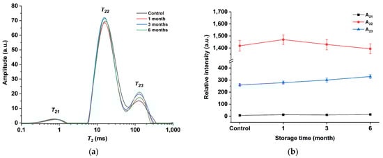 Additionally, LF-NMR was utilized to assess the alterations in water and lipid mobility of egg yolk powder during various storage periods. In LF-NMR, two critical parameters that are associated with the physicochemical structure of the sample are relaxation time and peak area. Relaxation times provide insight into the mobility of different water and fat components, while peak areas reflect the content of each water and fat component [45]. Figure 7a shows the T2 multiexponential fitted relaxation curves of the egg yolk powder at different storage periods. Three peaks (T21, T22, and T23) can be observed from this curve. The T21 peak is around 1 ms, which is the fastest relaxation component and belongs to water or lipids closely related to macromolecules [46]. The T22 peak is around 10 ms and reflects water and lipid molecules in the macromolecular network [47]. Peak T23 is around 100 ms and represents the hydrogen proton of lipids in the yolk [48]. By observing the curve in the figure, it can be found that T22 and T23 are continuous in the egg yolk gel. This phenomenon is consistent with the results obtained from the oil studied by Li et al., which contained two continuous characteristic peaks in the 10–100 ms range [49].
