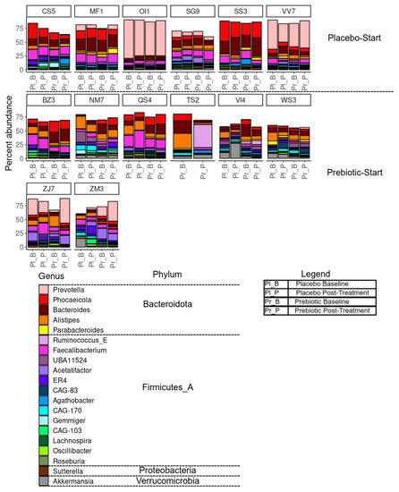 Notable individual variable responses include subject TS2, who displayed a large shift in taxonomic composition between time points during prebiotic treatment, and subject VI4, who showed high levels of Akkermansia during the placebo treatment but not during prebiotic treatment (Figure 4).