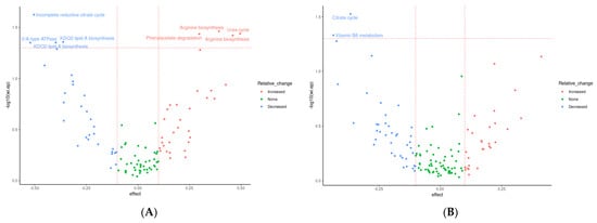 Several significantly differentially abundant pathways and modules were observed between time points during both placebo and prebiotic treatment, again indicating a potential carryover effect (Figure 6). The KEGG pathway associated with the citrate cycle was decreased during both placebo (p = 0.03, unadjusted) and prebiotic (p = 0.02, unadjusted) treatment. The pathway associated with vitamin B6 metabolism (p = 0.04, unadjusted) was downregulated during prebiotic treatment, and the pathways associated with microRNAs in cancer (p = 0.01, unadjusted) and cysteine/methionine (p = 0.04, unadjusted) were decreased during placebo treatment. In a similar fashion, multiple KEGG modules associated with the citrate cycle (Figure 6) were decreased during both treatments (prebiotic p = 0.05; placebo p = 0.04, unadjusted). Perhaps of most interest is the various upregulated modules associated with arginine metabolism observed during the prebiotic treatment (p < 0.05, unadjusted) (Figure 6A and Figure 7). None of these changes remained statistically significant after correction for multiple testing.
