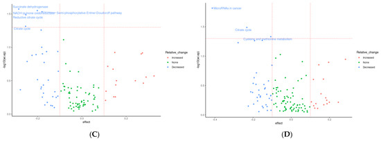 Effects of 3-week supplementation of the MOJU Prebiotic Shot or placebo (without fibres) on gut microbiota functional metagenome in healthy adults. Data represent a volcano plot of differential abundant KEGG modules (A) with prebiotic fibres and (C) placebo, and KEGG Pathways (B) with prebiotic fibres and (D) placebo, between groups. The X-axis position of each point represents effect size differences at the end of the intervention, coloured by change relative to baseline. The horizontal line represents the unadjusted p-value cut-off at 0.05; the vertical lines represent effect sizes of −0.1 and 0.1. N = 14.