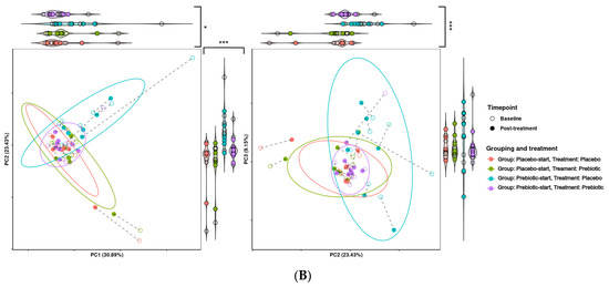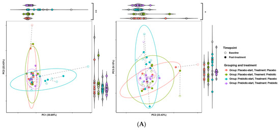 Both Shannon and Simpson diversity was observed to be significantly enriched as a result of prebiotic treatment when compared to placebo (p = 0.0027 and 0.0056, respectively) (Figure 2A,B). This is in agreement with the literature, as prebiotics have been shown to increase gut microbiome alpha diversity in a number of instances [87,88].