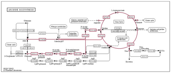 We were particularly interested in the several upregulated amino acid (AA) related functional modules during the prebiotic treatment (Figure 6A). Two pathways for arginine biosynthesis (KEGG modules M00845 and M00844), the urea cycle and phenylacetate degradation to acetyl-CoA/succinyl-CoA B. adolescentis, express the genes for all these pathways (https://www.genome.jp accessed on 1 January 2023) and may be the reason for the upregulation of these functions observed in our study (Figure 8).