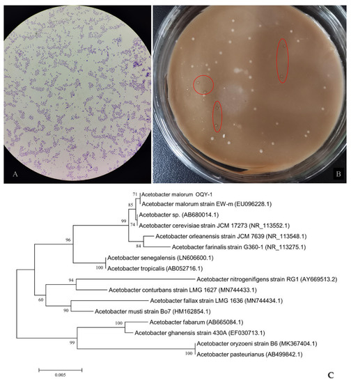(A) Cell morphology of the strain OQY-1 under a microscope; (B) colony morphology of the strain OQY-1 on acetic acid agar; (C) a phylogenetic tree based on 16S rDNA gene sequences of the strain OQY-1 and other Acetobacter species. Percent bootstrap values above 60 (1000 replicates) were indicated at nodes. Scale bar = 0.0050 substitutions per nucleotide position. Sequence alignment and comparison was performed using MEGA version 7.0. Neighbor-joining trees were constructed using MEGA version 7.0.