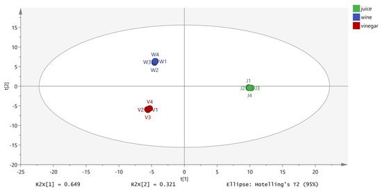 Fermentations had a significant impact on the composition of the volatile components. While the concentrations of some components decreased or disappeared altogether, those of some other components increased and new compounds emerged. For example, the concentration of terpinen-4-ol decreased from 496.69 ± 7.6 mg/L in the juice to 56.09 ± 2.94 mg/L in the wine and 44.83 ± 5.78 mg/L in the vinegar, while that of D-limonene dropped to non-detectible levels in the wine and vinegar samples. PCA of the GC-MS data confirmed the trends as the volatile components of the samples were well-separated into three clusters (Figure 2).