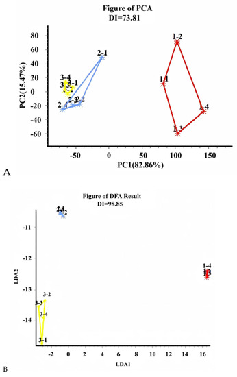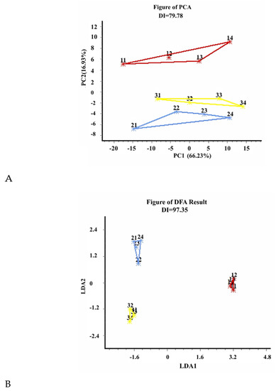 Electronic-nose analysis was performed using a SuperNose (SuperNose, Isenso, Torrance, CA, USA). The E-nose consisted of a sampling apparatus and a detector unit containing an array of 14 interactive sensors made of metal oxides for data recording and preprocessing. Principal component analysis (PCA), linear discriminant analysis (LDA), and radar map analysis were performed using Origin Pro 9.0. For the E-nose analysis, each sample (15 mL) was placed in an airtight vial and covered by sealing films. The volatiles of the sample were pumped into the sensor chamber through an inserted needle. The analysis run was controlled by the equipped software, and the sampling process lasted for 2–3 min and ended automatically. Each sample was taken in quadruplicate and the average of the sensor data was used for subsequent statistical analysis.
