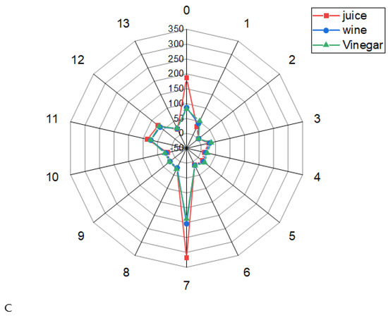 Discriminant function analysis (DFA) was used to classify these three samples (Figure 3B). DFA uses a linear combination of the original variables to construct a discriminant function. The DFA model is based on a search for directions along which the groups are as far apart as possible and the samples of the same group are as close together as possible, which is also used to identify and classify unknown samples. In contrast to PCA, DFA is used to distinguish groups by maximizing the distances between groups, while minimizing the distances between samples in the same group [15]. As can be seen, the individual samples in Figure 3B were distributed in different areas of the graph and did not overlap with each other, with good repeatability. The DI value was 98.85%, indicating that the odors between the three types of samples could be distinguished. The radar plots of the sensor responses of different samples are shown in Figure 3C. The radar maps of wine and vinegar were similar, and both were significantly different from that of the juice.