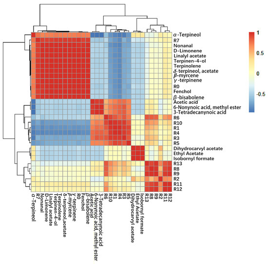 Correlations between the results of the E-nose and GC-MS analysis of the lemon peel juice, wine, and vinegar. The color from blue to red represents correlations ranging from negative to positive relationships.