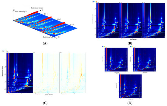 A two-dimensional topographic spectrum (planform of the 3D plot) was also obtained for its difficulty to observe the differences between three-dimensional groups (Figure 1B). In this plot, the red vertical line at 1.0 on the left is the reaction ion peak (RIP), and the background image is blue. Each point on both sides of the reaction ion peak represents a VOC, the color depth represents the volatile-compound content, the white area represents the low compound content, and the red area represents the high compound content. Using the difference comparison mode, we select the spectrum (JH-1) of one sample as the reference, and we deduct the spectrum of other samples from the reference to obtain Figure 1C. If the volatile organic compounds of the two samples are consistent, then the background after deduction is white, while red signifies that the concentration of the substance is higher than the reference, and blue implies that the concentration of the substance is lower than the reference. It can be seen from Figure 1B,C that signals are concentrated in areas A, B, and C. The color of some compounds in areas A and C is deepened, and the color of compounds in area B is lighter, which suggests that with the increase in irradiation dose, the compound content in regions A and C increases and in the regioqualitative analysis of volatile organic compounds.