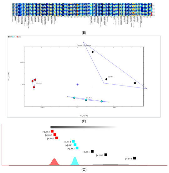 Figure 1G shows the fingerprint similarity analysis of three volatile oil samples with different irradiation intensities. It can also be seen from the figure that the volatile organic compounds of JH-2 and JH-3 are very similar, the distance between them is very close, and the results of the principal component analysis are consistent with those of fingerprint analysis. There are substantial differences in volatile organic compounds between volatile oil samples (JH-1, JH-3) with large differences in irradiation intensity.