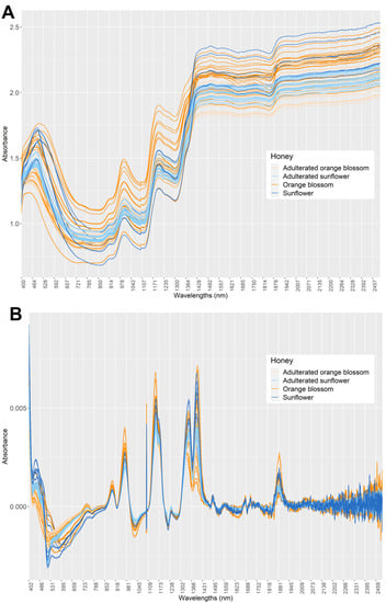 First, it must be noted that both the honey samples and the adulterants contain the same major compounds, i.e., sugars and water; therefore, high similarity among all Vis-NIR spectra can be expected. In this first stage, the objective was to determine if there was a tendency for samples to be grouped according to their botanical origin (orange blossom and sunflower) as well as the level of adulteration by using the spectroscopic signals from minor compounds in the different samples. For this reason, the complete data matrix (D70×4200) consisting of the 70 samples (nonadulterated and adulterated) and the 4200 variables (wavenumbers) was used. In Figure 1A, the raw spectrum of all samples was represented based on their botanical origin and the presence/absence of adulteration: adulterated orange blossom samples (light orange), nonadulterated orange blossom samples (dark orange), adulterated sunflower samples (light blue), and nonadulterated sunflower samples (dark blue).