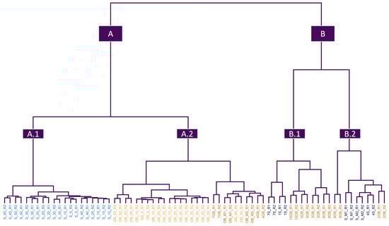 As can be seen, the dendrogram has been divided into two main clusters called “A” and “B”. Cluster A is divided into two subgroups: Cluster A.1, which exclusively contains all adulterated sunflower samples (colored light blue), and Cluster A.2, which contains all adulterated orange blossom samples (colored light orange), but also some nonadulterated orange blossom samples (colored in dark orange). These results show a strong tendency for grouping based on whether the adulterated sample was from sunflower or orange blossom. On the other hand, Cluster B is divided into two subgroups (“B.1” and “B.2”), which contain the remaining unadulterated orange blossom samples and all the unadulterated sunflower samples (colored pink). Focusing on Cluster B.1, it can be observed that it is divided again into two groups, distinguishing sunflower samples from orange blossom ones. In the case of Cluster B.2, the distinction is not so clear, and some sunflower samples appear mixed with orange blossom samples.