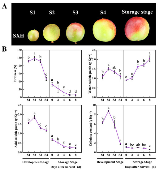 3.2. Correlation between Fruit Firmness and Cell Wall Composition at Different Developmental Stages