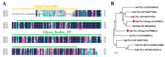 Sequence analysis of PpCTL1 and PpCTL2. (A) Multiple sequence alignment of PpCTL1/2 and AtCTL1/2 proteins. Different colors indicate different similarities (black: 100%, magenta: 75% and blue: 50%). Glyco_hydro_19 represents the conserved domain of the glycosyl hydrolases 19 family. The signal peptides were analyzed by Signal 4.0. The red star indicates the amino acid residue S-K-T-S lacking catalytic activity. Multiple amino acid sequence alignments were performed by DNAMAN 6.0 software. (B) Phylogenetic analysis of PpCTL1/2 and partial CTL proteins from Arabidopsis thaliana, cotton (Gossypium hirsutum), pear (Pyrus x bretschneideri), rice (Oryza sativa), oil palm (Elaeis guineensis) and maize (Zea mays). Phylogenetic trees were constructed using MEGA 6.0 software with the neighbor-joining (NJ) method.