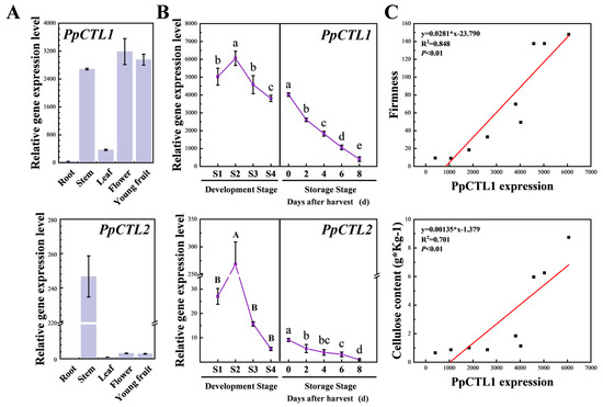 The gene expression level of PpCTL1 and PpCTL2 in peach. (A) Relative expression levels of PpCTL1 and PpCTL2 in different tissues. (B) Relative expression levels of PpCTL1 and PpCTL2 at various developmental stages of fruit. Data are expressed as means ± SD from at least three samples. Different lowercase letters in the figure denote significant differences between sampling dates for fruit by Duncan’s multiple range test (p < 0.05). Different uppercase letters in the figure indicate significant differences by non-parametric variance analysis test. (C) Correlation analysis between the expression levels of PpCTL1 with firmness and cellulose content at different developmental stages. P is correlation coefficient. Each RT-qPCR was normalized using the cycle threshold value of the PpCYP2 (Prupe.8G233900) and PpTua5 (Prupe.6G004100). The relative expression level was calculated by the 2−ΔΔCt method.