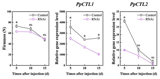 Changes in the firmness and relative expression of PpCTL1 and PpCTL2 of control (TRV2) and RNAi (TRV2-PpCTL1) fruit. Data are expressed as means ± SD from at least three samples. The asterisk indicated a significant difference (p < 0.05), using the two-tailed Student’s t-test. ns, no significant. Each RT-qPCR was normalized using the cycle threshold value of the PpCYP2 (Prupe.8G233900) and PpTua5 (Prupe.6G004100). The relative expression level was calculated by the 2−ΔΔCt method.