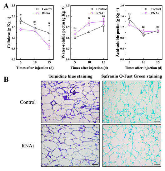 Change in contents of cellulose, water-soluble pectin (WSP), acid-soluble pectin (ASP) and cell wall structure. (A) Changes in the cellulose, WSP and ASP of control and RNAi fruit. Data are expressed as means ± SD from three samples. The asterisk indicated a significant difference (p < 0.05), using the two-tailed Student’s t-test. ns, no significant. (B) Cell wall structure was observed by paraffin section. The control and RNAi fruit were collected at 5 days after injection. The sections were stained with toluidine blue and Safranin O-Fast Green staining. Cell walls containing cellulose appeared green under Safranin O-Fast Green staining and blue-purple under toluidine blue staining. Scale bars = 100 μM.