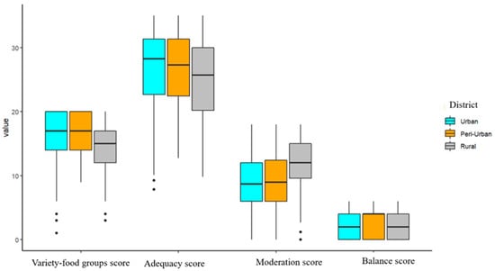 Figure 1 shows that the sizes of the boxplots of the four categories for three sites are almost the same. The rural site has a lower value for variety-food groups and adequacy score, but not for moderation score. Interestingly, 25% of urban and peri-urban sites obtain the maximum score for a variety of food groups, whereas 25% of all three areas have the lowest balance score. More descriptive statistics between gender, age, household size, education level, and income level are presented in the Supplementary Materials. The correlation between diet quality and household size and age are weak and not significant (Table S2 Supplementary Materials). The variations of diet quality by income level are similar, except for households having less than VND 7 million (as shown in the interquartile range of the boxplot) (see Figure S1—Supplementary Materials). By education level, households with higher education levels tend to score higher for variety-food groups score, adequacy score, and VQI-V score (Figure S2). However, an inverse trend for moderation score by education level is detected. Diet quality shows similar statistical values by male and female (Figure S3).