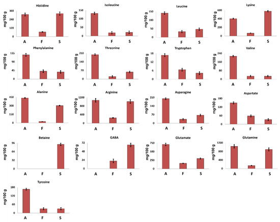 Quantitative histograms relative to free amino acids measured in 1H NMR spectra of Bligh–Dyer hydroalcoholic extracts. A. biennis (A), F. iberica (F), S. hirsutum (S).