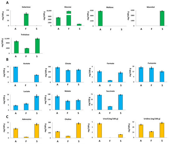 Quantitative histograms relative to (A) free sugars, (B) organic acids, and (C) Adenosine, Choline, Uracil and Uridine quantified in NMR analysis of Bligh–Dyer hydroalcoholic extracts. A. biennis (A), F. iberica (F), S. hirsutum (S).