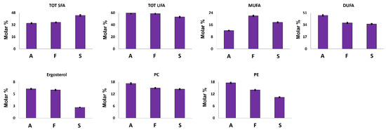 Quantitative histograms relative to quantified fatty chains, ergosterol and polar lipid heads from the NMR analysis of Bligh–Dyer hydroalcoholic extracts. A. biennis (A), F. iberica (F), S. hirsutum (S).